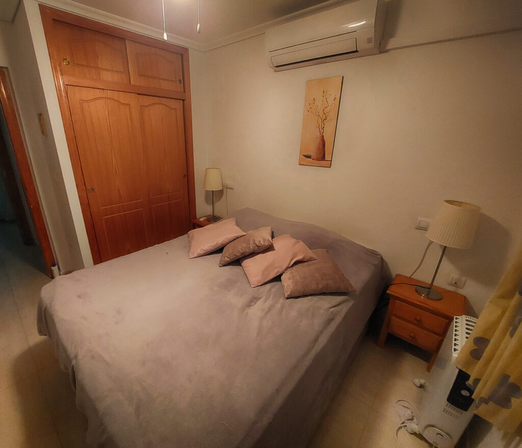 Sovrum 1 – Dubbelsäng, takfläkt, AC, TV med Chromecast, garderob, fönster mot framsidan