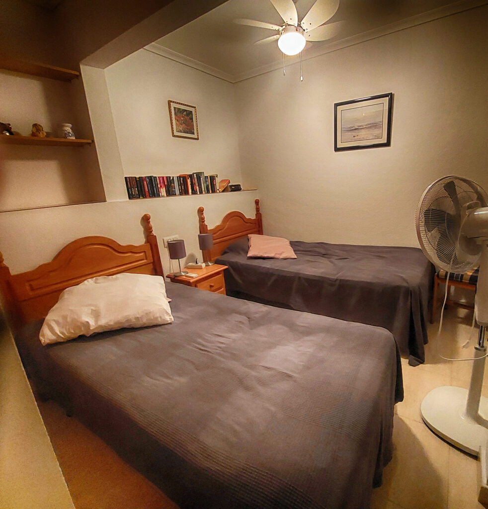 Sovrum 2 – två enkelsängar, takfläkt, golvfläkt, garderob, dörr till en liten uteplats.